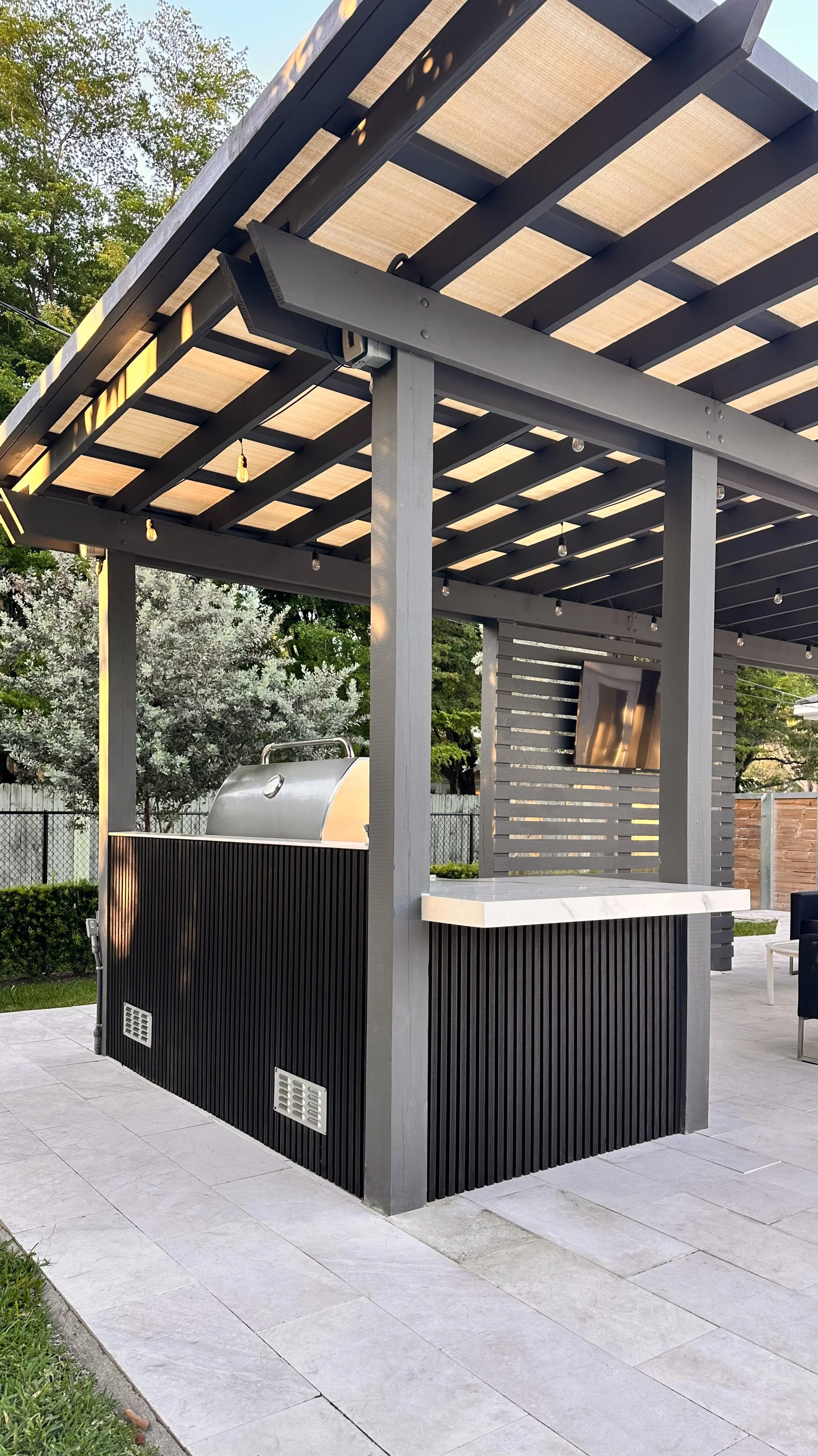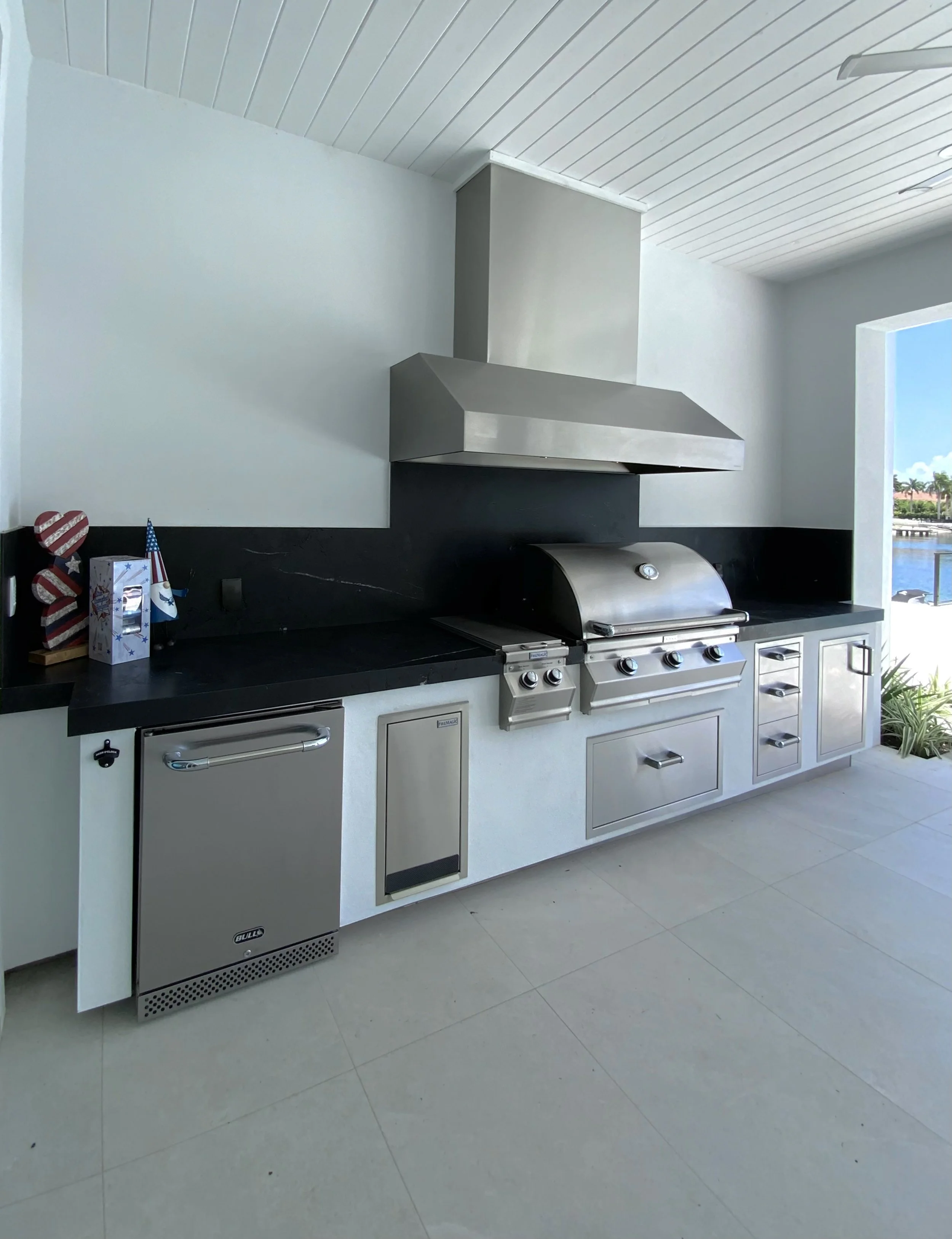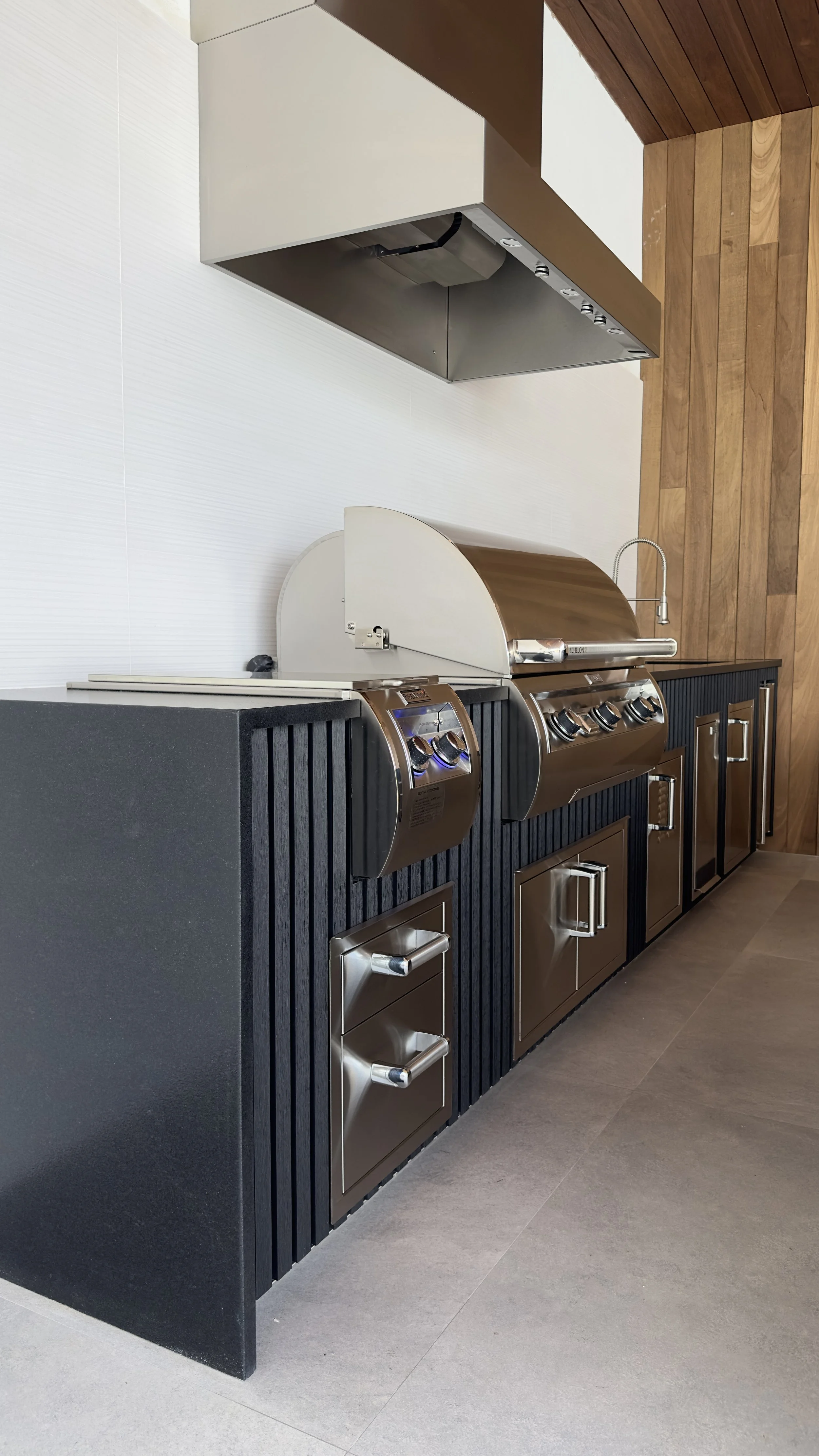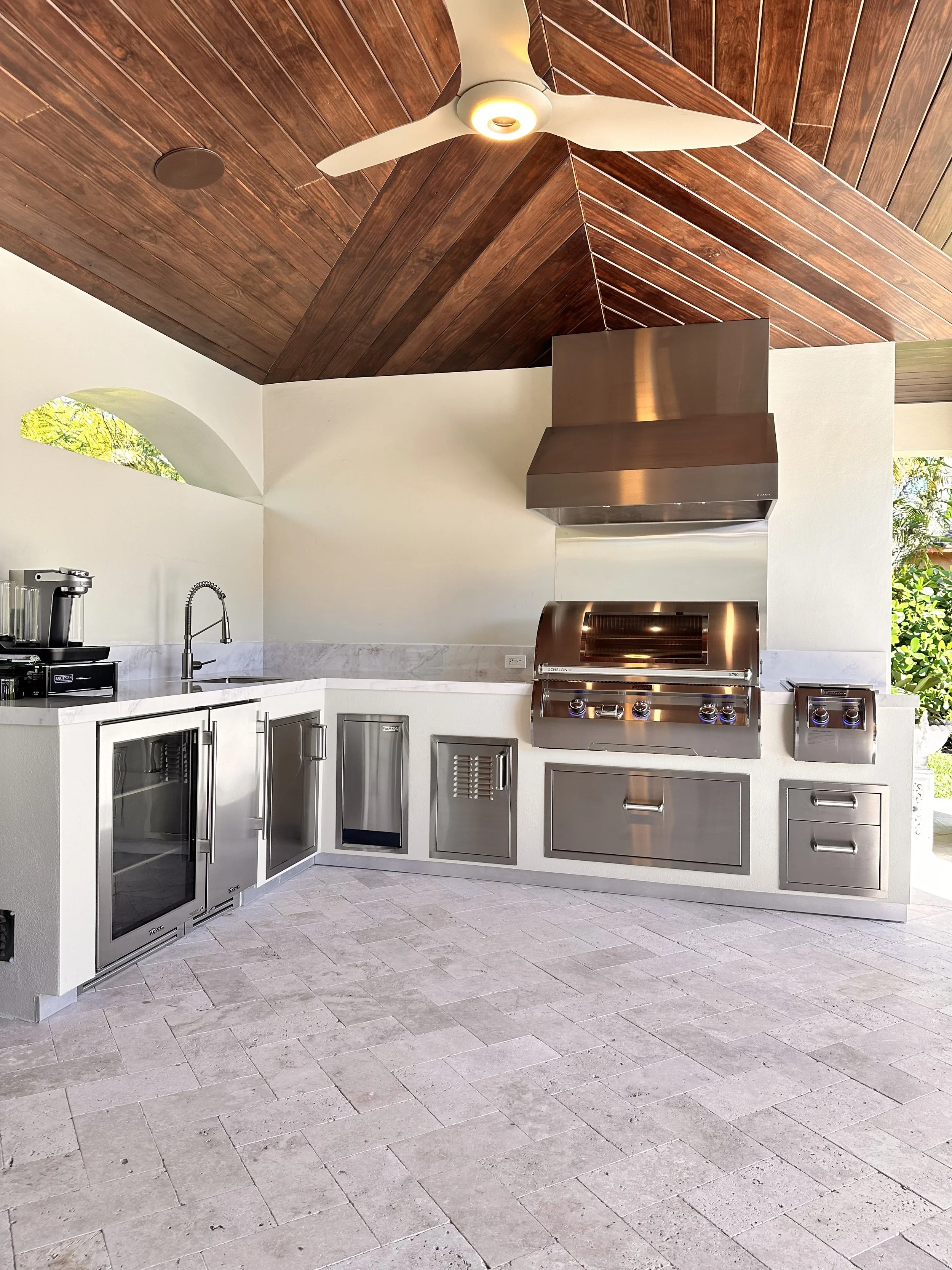 Picking your fascia finish is very important, for this material will complement the full design and style of your outdoor kitchen. Some materials are more maintenance intensive than others, however some of the materials that have more maintenance sometimes are also the most warm and modern. We offer a large variety of finishes including but not limited: Porcelain tile, ceramic tile, stucco finishes smooth and texture, IPE wood, stainless steel, marble tiles, stone veneer, natural and manmade stones, glass tile, and mini stone. We like to integrate all sorts of different finishes as these are details that make the kitchen feel truly custom and design for you and your home.