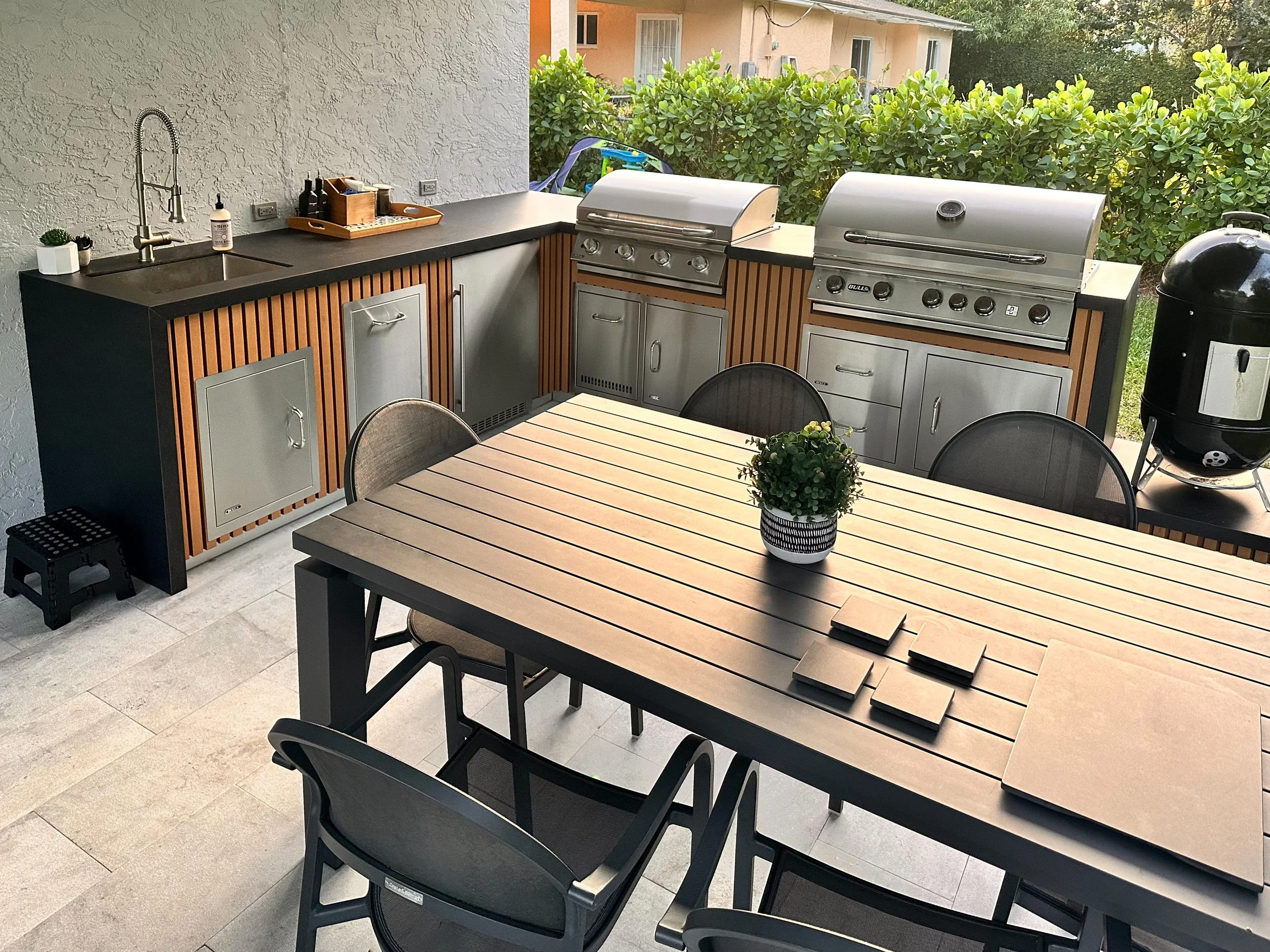 Stucco finish is a very durable surface that can be applied in various forms. It can be finished in a smooth surface, rough texture, texture line. Outdoor kitchens can be easily updated with stucco as their paint color can be changed with a new coat of primer and paint.